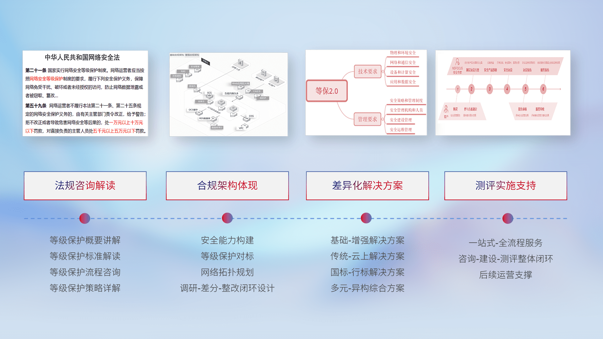 通过专业的法律咨询解读、、、合规架构体现、、差异化解决方案、、、、测试实施支持等服务,,为客户量身打造等保合规体系。。